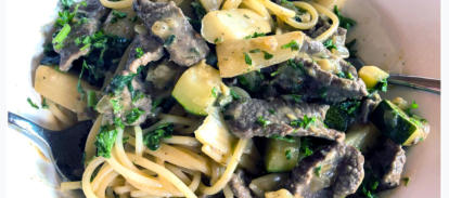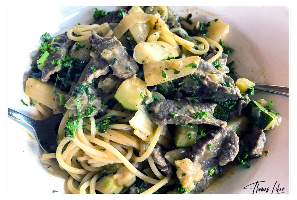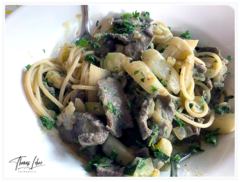 Die Spagetti in ausreichend Salzgwasser aldente garen und in einem Sieb abtropfen lassen.