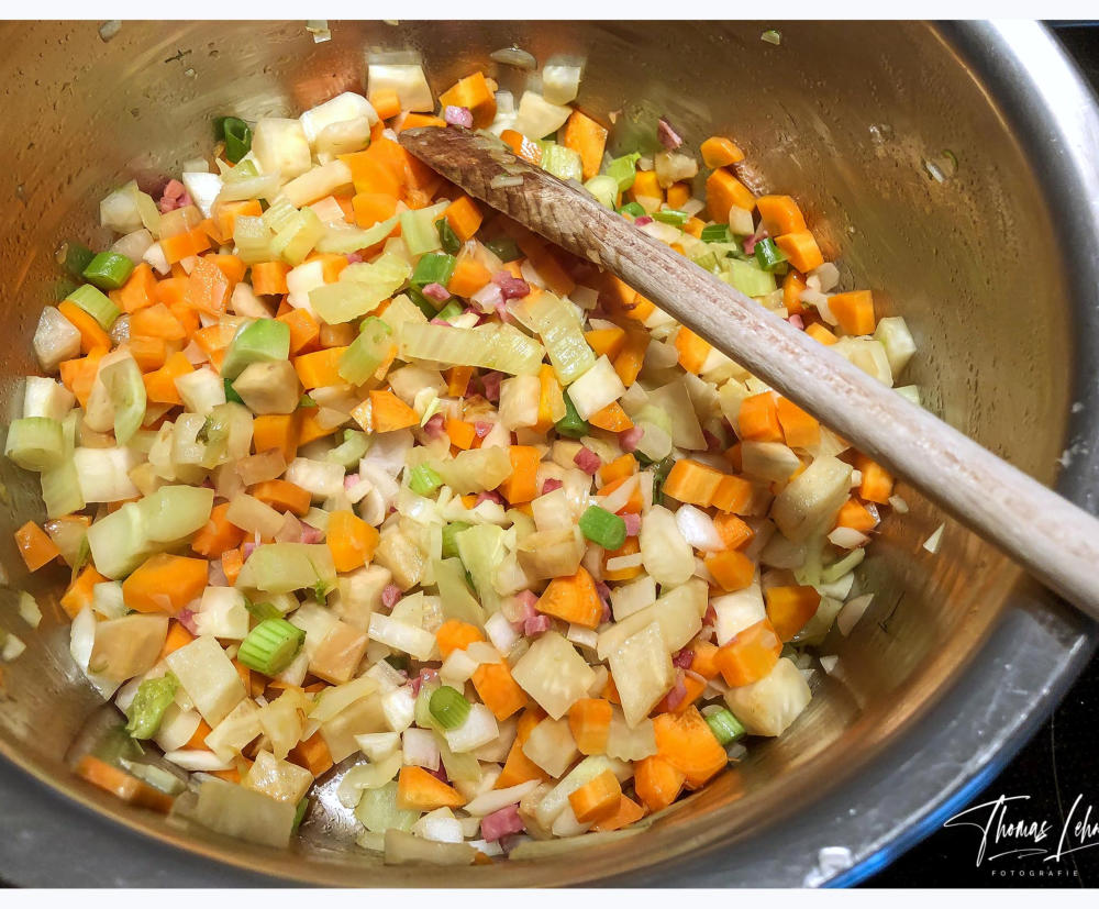 anbraten und danach das Gemüse und den Knoblauch anschwitzen.