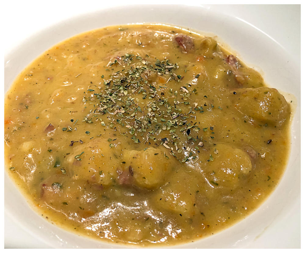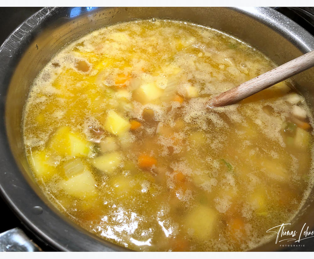 Kartoffelpuffer in 2 cm Quadrate schneiden und in die Kartoffelsuppe geben.