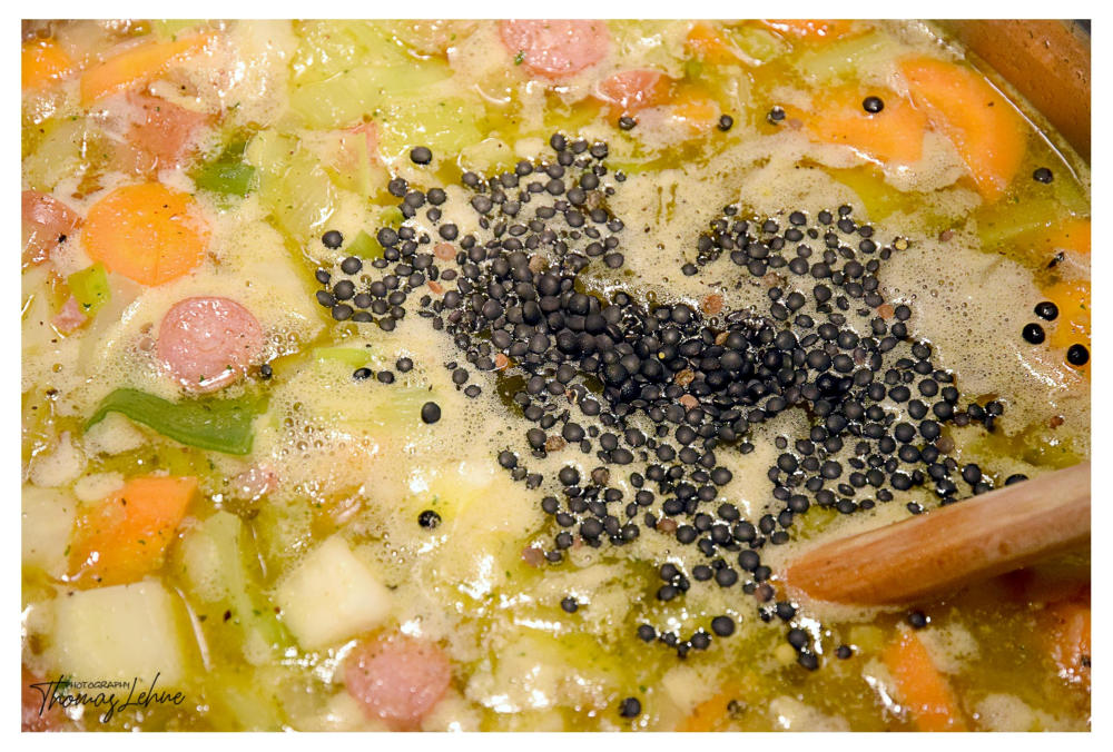 Tassen Beluga-Linsen hinzugeben. Alles mindestens 35 min. köcheln lassen, danach die in