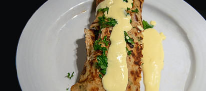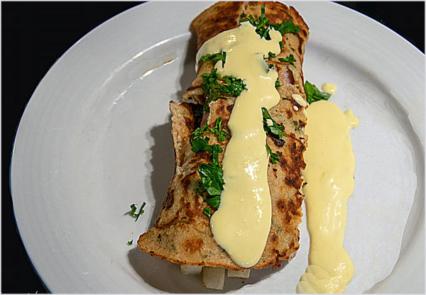 Den Pfannekuchen vorsichtig einrollen und mit Hollandaise anrichten.