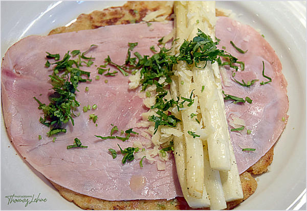 Den Pfannekuchen einer Scheibe Kochschinken und mit jeweils 3-5 Spargelstangen