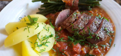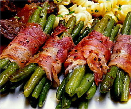 MIT GRÜNEN BOHNEN & BACONMANTEL UND FRUCHTIGER TOMATEN-SAUCE