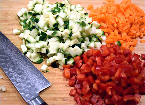 geputzte Möhren, in kleine Würfel schneiden. 150 g Zucchini samt der grünen Haut ebenfalls